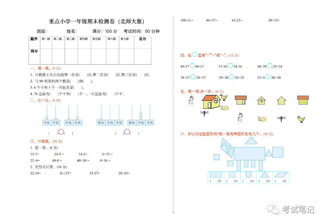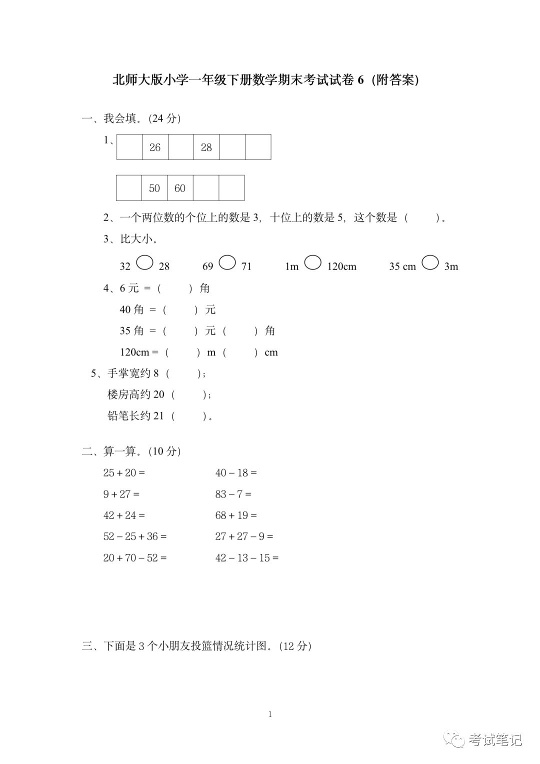 一年级数学(北师大版):期末测试卷3套,为孩子收藏!