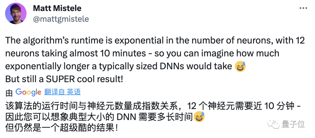 所以就有网友提出疑惑:算法运行时间与神经元数量成指数关系,12个神经元需要近10分钟,那计算一个普通大小的DNN所需时间岂不是长了去了……
