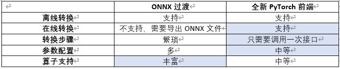 对比以 ONNX 作为中间过度的方式,新 PyTorch 前端有以下特点: