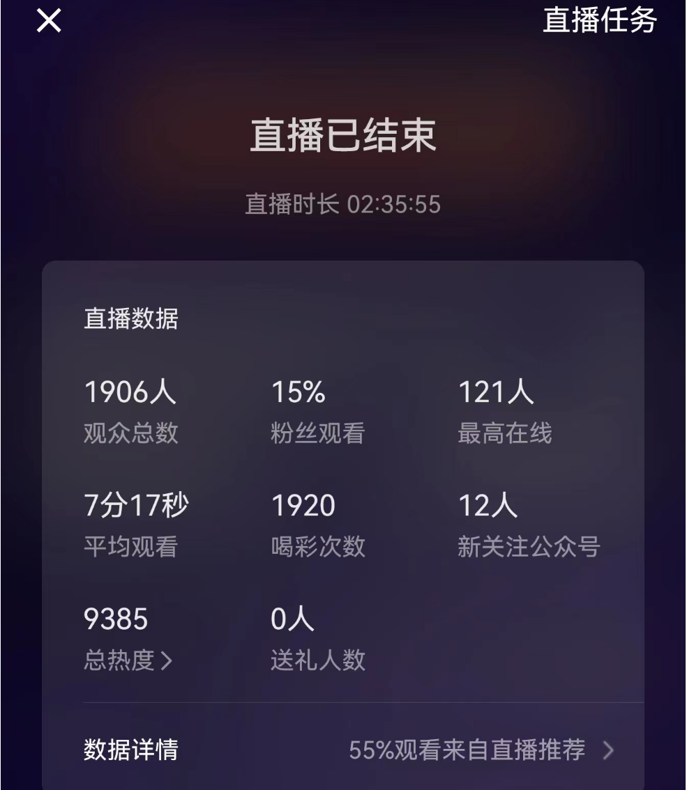 从直播到下播,两个半小时,以为一个小时都顶不住,家里有点事,就下播了,开始有点紧张,后面自然很多,是个好的开始,各方面的突破了,数据相对还行,对我这新手,场观1900人,对我鼓励很大。