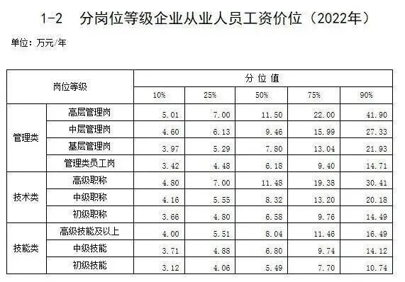 2022年的分岗位等级企业从业人员工资价位中,高层、中层与基层管理岗的各分位值工资,均高于高级、中级、初级职称技术类岗位和高级及以上、中级、初级技能类岗位。