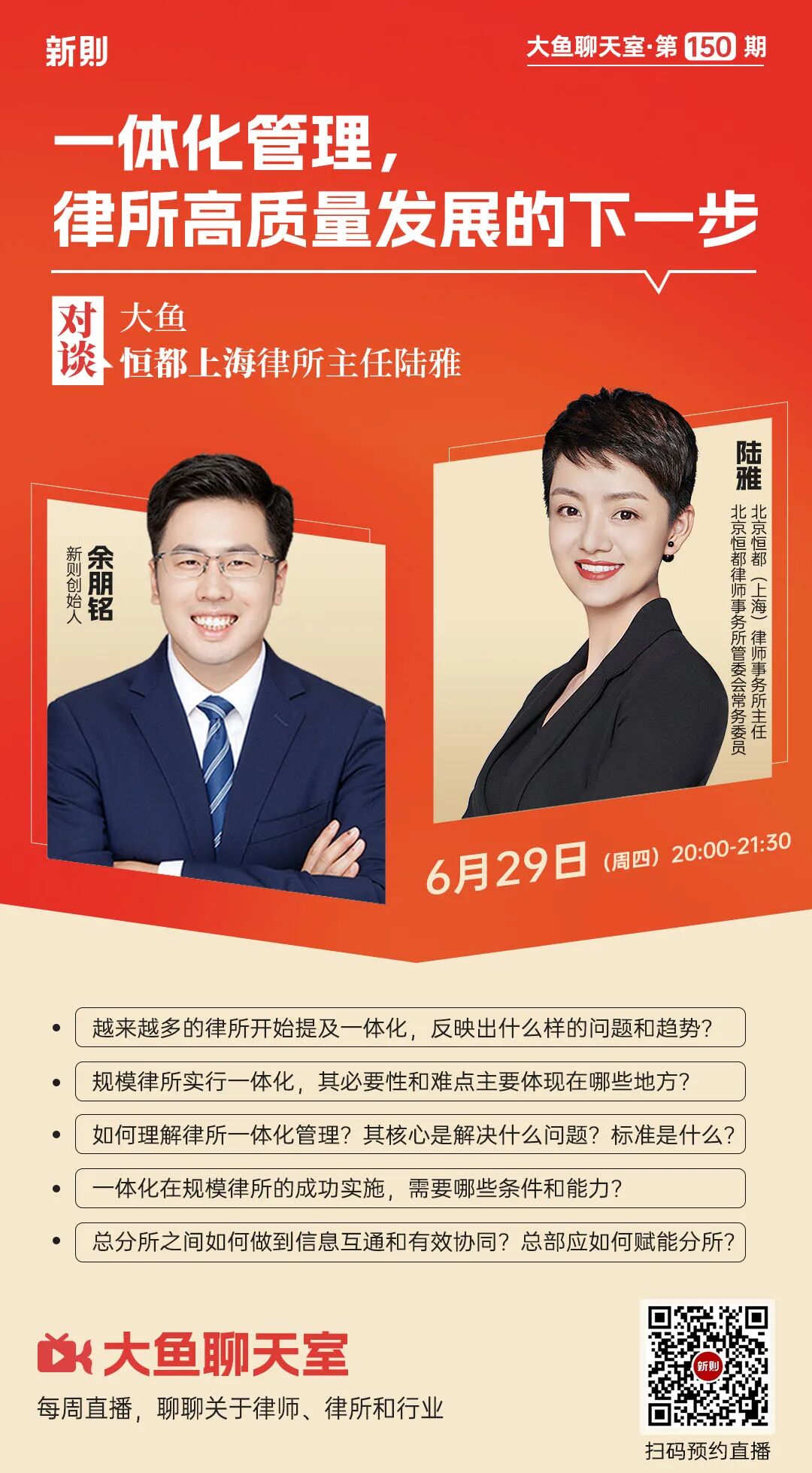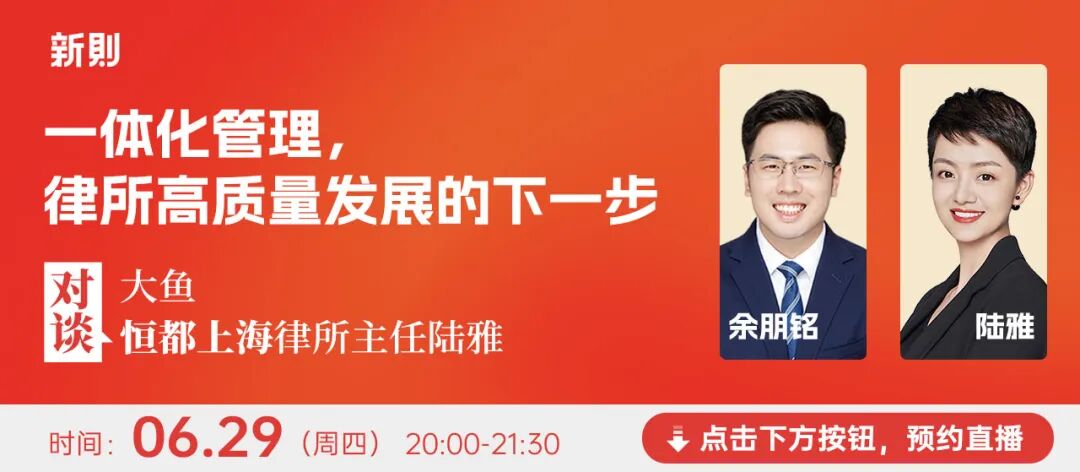 6月29日晚上8点(周四),大鱼与恒都上海分所主任陆雅,共同探讨「一体化管理,律所高质量发展的下一步」。