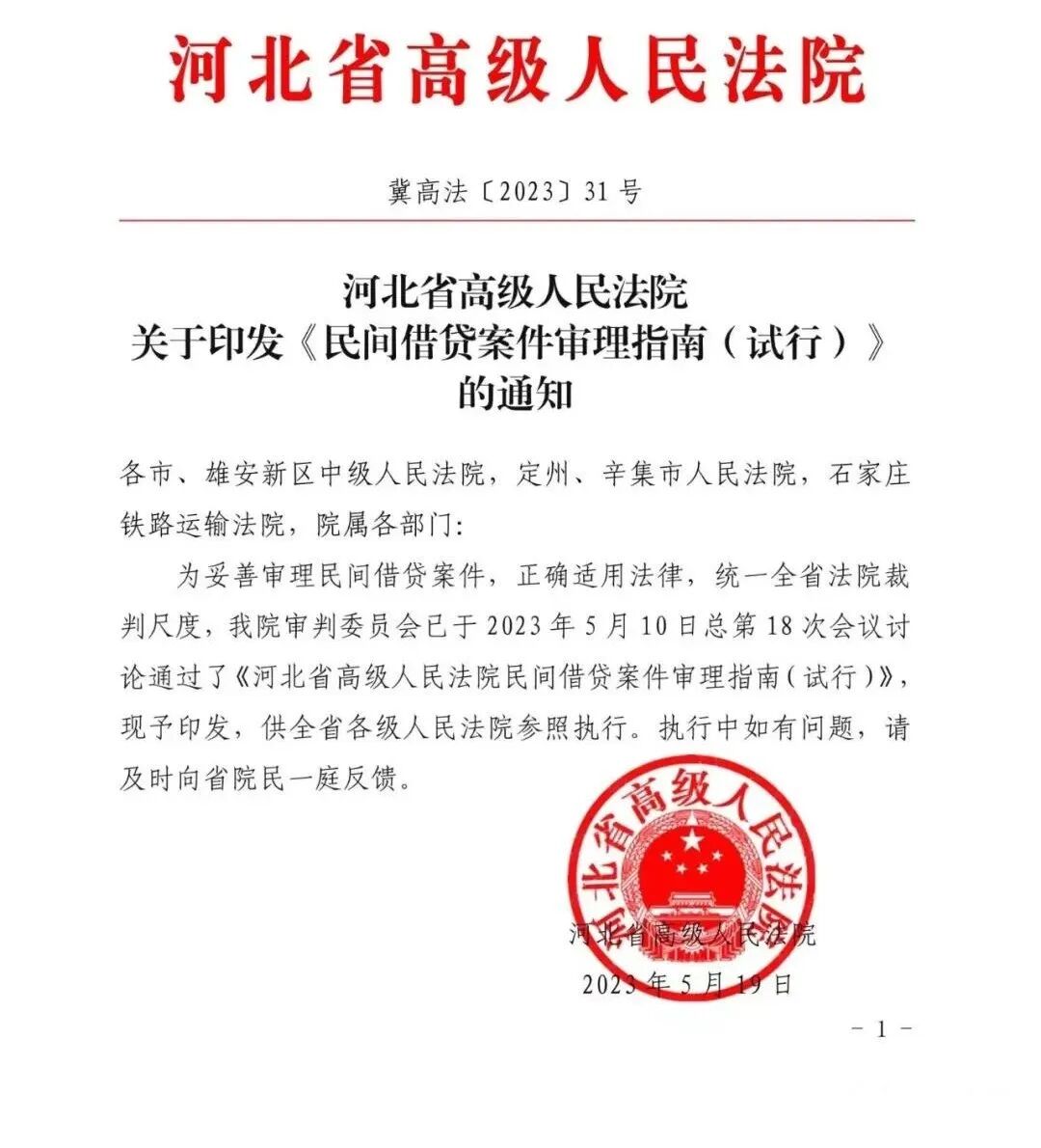 河北省高级人民法院于2023年5月19日印发《民间借贷案件审理指南(试行)》,对民间借贷案件审理中的难点和热点问题进行了回应,释明并统一了相关争议问题的法律适用,提供了可参考的裁判观点。来源|河北省企业破产管理人协会