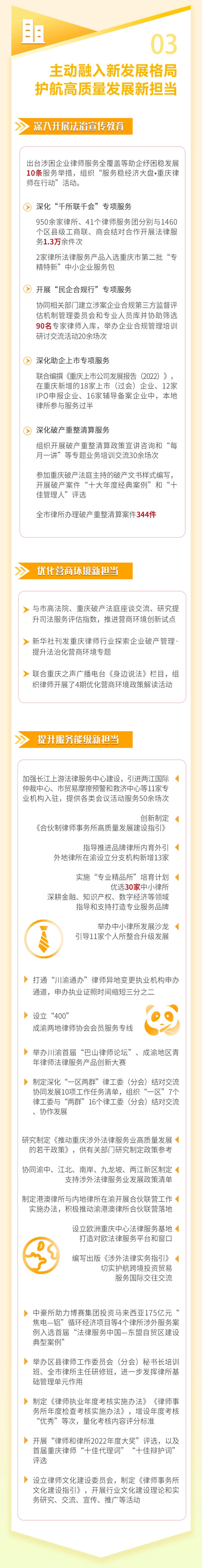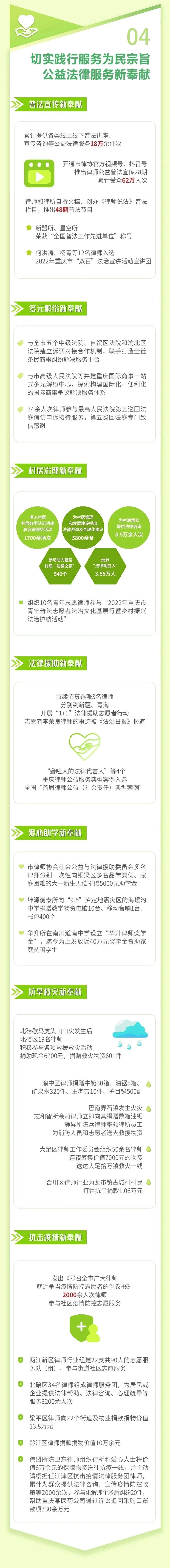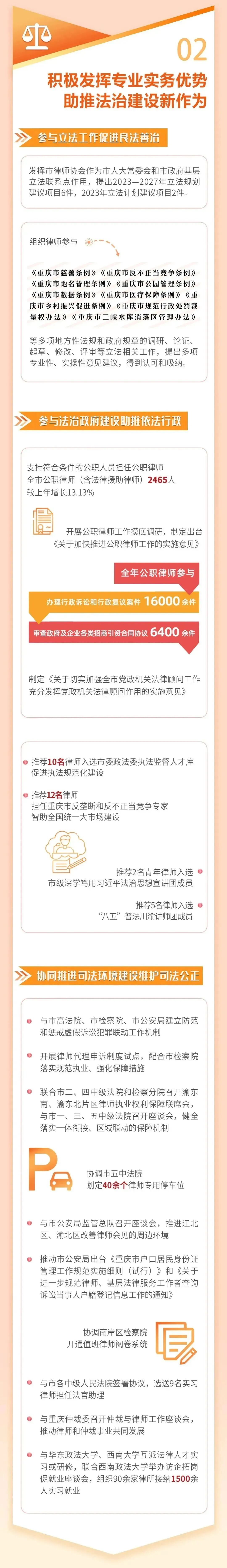 6月20日,重庆市司法局和市律师协会联合发布2022年度《重庆律师行业社会责任报告》。截至2022年末,全市律师有16069人,较上年增长10.21%;全市每万人拥有律师5名;律师事务所910家。2022年,全市律师办理诉讼案件和非诉讼法律服务30.48万件,较上年增长7.26%;担任法律顾问2.45万家,较上年增长8.31%。