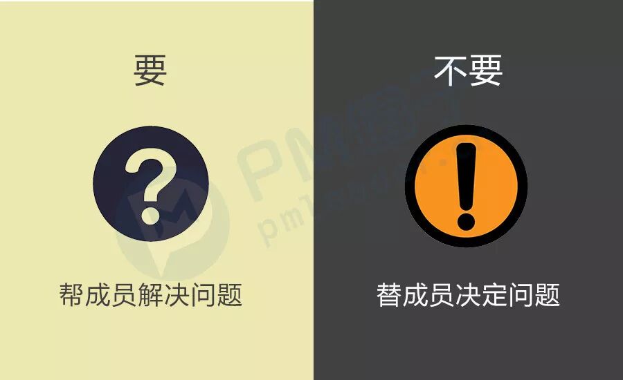 项目里有无数细枝末节的小问题,项目经理要学会把问题交给成员自己解决,我们可以帮他分析利弊,但是不要直接帮他做决定。