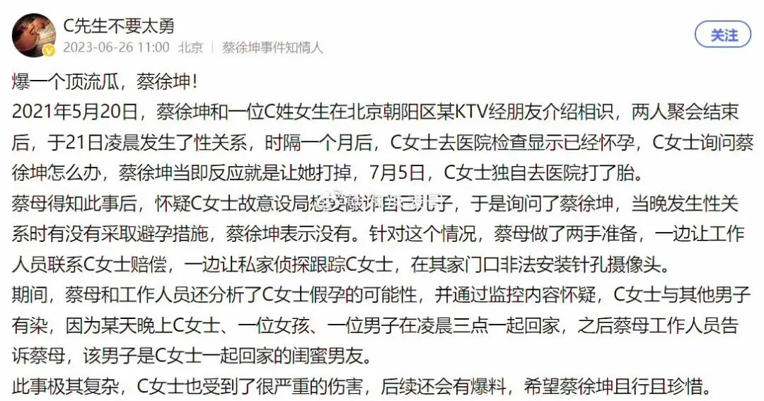 紧接着网上又出现新的爆料内容,根据蔡徐坤过去被传过的瓜,分析出他除了被曝的这个做人流的孩子外,剩下还有来自不同母亲且被生下来的私生子,第一个私生子亲妈身份被质疑是时尚圈女大佬,说男方和妈妈有段时间在国外就是陪产去的;第二个私生子亲妈身份是网红,信息来源是被脱粉的粉丝扒到的;第三个私生子亲妈身份是富婆女粉,对方怀的时候还未成年,生完孩子后才成年(有说是这回曝光的女方);第四个私生子亲妈身份被质疑是,被曝过曾有相同行程在袁维娅身边的Jerry...