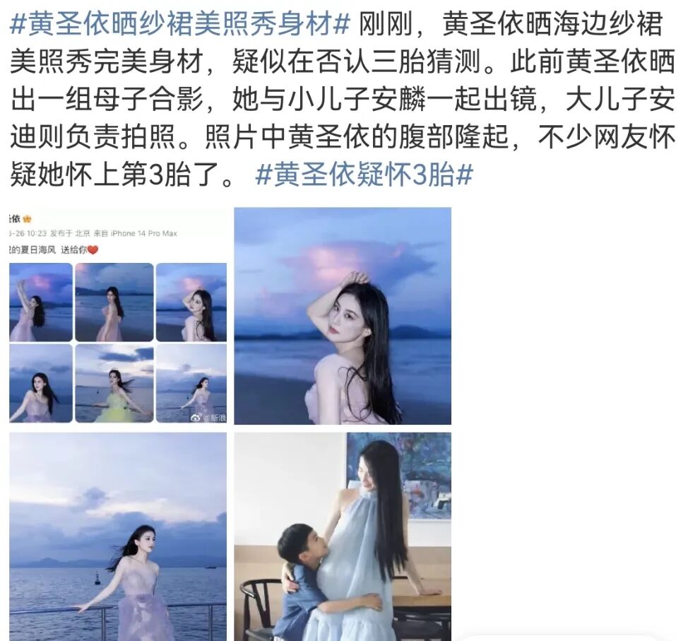 黄圣依最近放出跟儿子的一组照片,因为穿着宽松有点显得腹部凸起,就被网友质疑是怀了三胎,说她这是怕位置不稳高龄了也要拼生。紧接着,女方又晒出能明显看出腰身的照片,疑似证明自己没怀孕。这一来一回引起的讨论,有网友就觉的是女方故意炒热度,为了方便自家带货,也有觉得她这是此地无银三百两,故意遮掩怀孕的事。