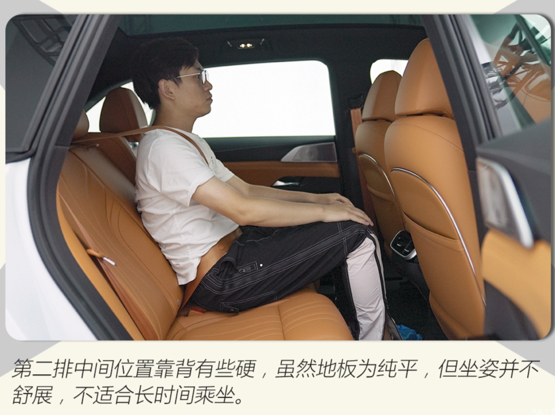然而, G9 的后排真就和 X3M 似的,不仅不宽敞,传统的三联座坐着也不舒服。一台车长接近 4.9 米的车,后排坐着愣是和蜷缩着似的,直接就把家用消费者排除在外了。