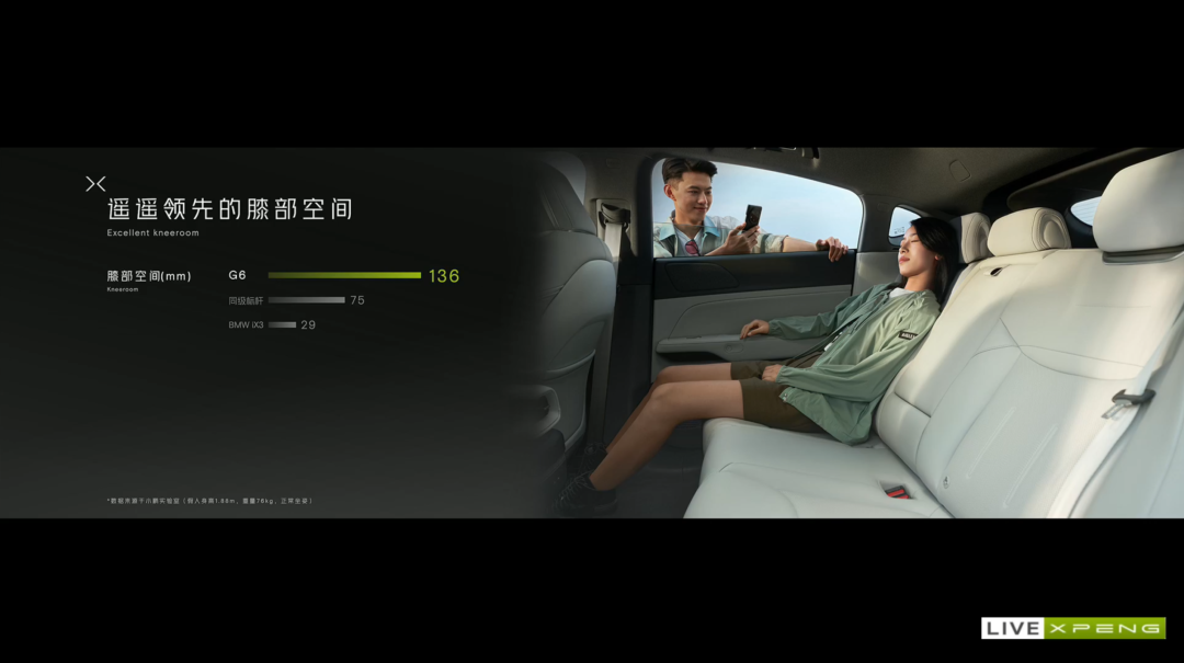 讲到后排的时候,何小鹏表示 G6 的腿部空间和乘坐体验,都能远超 “ 同级标杆 ” 。