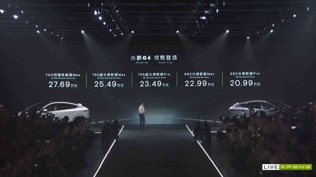 最后就是公布价格,并表示 G6 七月份就可以交付。自从当年蔚来 ET5 收了一堆订单交不出车以后,大家对上市即交付这件事看的是真的重啊。。