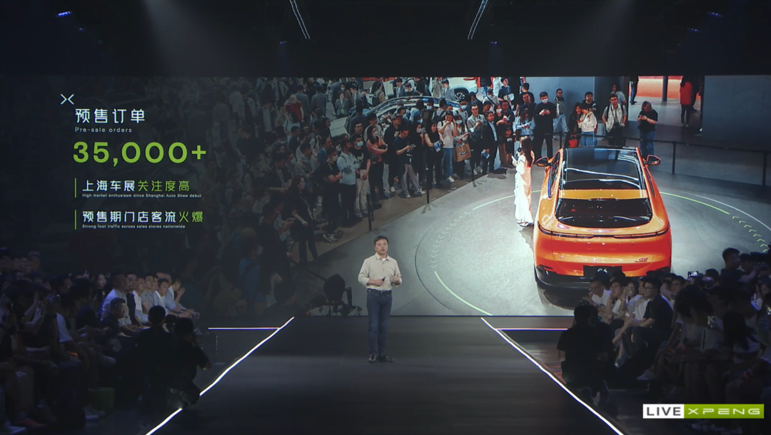 我们先看发布会。说车之前,何小鹏先炫耀了一下 G6 预售以后收到的盲订订单。三万五千单,甚至比他们今年第二季度卖的车还多。。。
