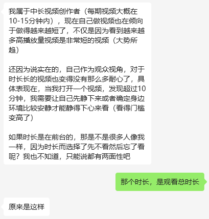 她并没有一味开香槟庆祝,而是认为:如果是显示观看时长的话,对创作者的要求其实就更高了,这里的 “ 高 ” 指的是,需要设置更多更好的的悬念反转起伏,目的为了能尽可能多地吸引和留住观众,而这一块明显是短视频创作者做的更好的,所以她并不认为显示 “ 观看时长 ” 是只有利于长视频创作者的,反而也是一次考验。