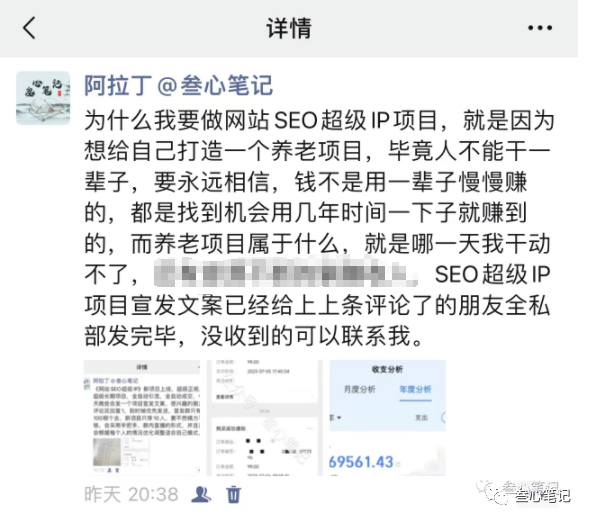 而这一次呢,上线了我压箱底的项目《网站SEO超级IP变现营》,收费还高,我也写了个宣发文案,在朋友圈互动了的我也都私发了。