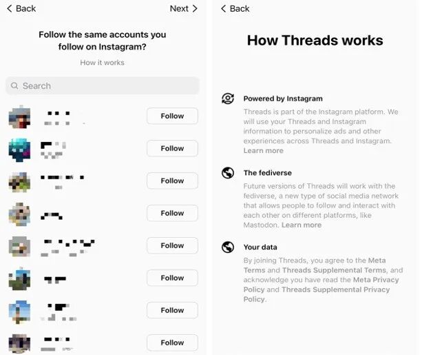 从当时的网页预览来看,Threads设置的功能几乎跟Twitter如出一辙:赞赏、评论、转发、分享。发送内容以短文字为主,也可以配图片、视频等。就在大家以为今天才能看到Threads“真身”时,昨天下午,Threads预告网站的倒计时突然加速,公测时间从东部时间7月6日上午的10点提速到了晚上7点。于是,新鲜出炉的Threads上手体验来了!首先,Threads跟Instagram的数据是安全互通的,下载好Threads之后在账号栏会自动显示你Instagram账号的名字和头像(并且无法更改),个人简介和外部账号链接也可以选择从Instagramn一键导入。接着,跟Instagram一样,你可以设置账号的可见范围,可以是公开账号,也可以是仅对关注者可见。在默认专注的推荐之中,所有的好友都来自于你的Instagram好友列表,你可以选择一键关注所有,也可以跳过推荐。在Threads的使用说明中,有以下两点内容值得重点关注:1. Threads确实是属于Instagram的一部分,Meta会使用你在Threads和Instagram上所发布的内容和相关信息来进行个性化的广告推荐或其他服务。2.Threads未来的版本会集成于Fediverse网络(Fediverse是指什么请看后文),未来Threads账户可以跟其他去中心化社交平台的用户进行互动。经过以上步骤、了解完Threads的基本信息之后,你就可以进入Threads的主页面了。首先先说优点,从设计和用户体验来说,Threads的页面和交互都做得非常好!用几个词形容就是:简洁、流畅、一目了然。每个账户的头像上都有一个加号,你可以直接点击关注,除了赞评转之外,你也可以点开别人的评论区进行查看和回复。据了解,Threads目前最多支持500个字节的文字消息,同时也支持图片、动图、视频等。但同时,你要问Threads有什么新功能、新玩法吧?现在倒也还没看出来。总体来看,无论是功能还是界面,Threads目前完全可以说是一个翻版Twitter,甚至说还是古早版的Twitter。毕竟Twitter还有趋势榜、投票、Space等各种功能。如果不是马斯克收购Twitter后一顿乱搞弄得大家都受不了,估计Meta推出一个这么类似产品肯定是骂声一片。但目前看来,大家的反馈普遍都比较积极,Threads的下载人数和新用户都在激增之中。大家在经历了过去一年Twitter时不时的宕机、付费认证、流量限制等一些列的Drama事件之后,似乎终于找到了一个兼具正常和主流的“类Twitter”平台。基于Instagram的庞大用户基础和Twitter目前“怨声载道”的现状,可以预见的是,Threads在未来一段时间内一定会迎来一波高速的用户增长。但作为全球社交媒体老大,Meta推出Threads仅仅只是想要做一个Instagram的文字版、一个古早版的Twitter吗?从目前Threads里埋下的一些“彩蛋”来看,事情或许还真没有那么简单。如果你留心的话,你会发现在Threads中,每个账户的旁边都有一个Threads.net的灰色按钮。这是干嘛用的呢?这或许就要回到前文中所提到的Fediverse(联邦宇宙)。Fediverse是由 " Federation(联邦) "和 "Universe(宇宙) "两个词组成的词语。所谓的联邦宇宙,指的是一个相互连接的、用于网络发布和文件托管的服务器网络,这些服务器使用开放标准进行相互通信,是一种分布式的网络模式。怎么理解呢?大家知道,在过去大部分的网络服务都是中心化的,比如Twitter的数据由Twitter存在自己的服务器里,Meta的数据存在Meta的,掌握数据的公司拥有对这些数据的独家和绝对访问权。但Fediverse则由一系列由用户自建或第三方托管的互相连接的服务器组成,虽然各个服务器是独立运行的,但在这些服务器上所运行的软件支持一种或多种遵循开放标准的通信协议,这样不同服务器的数据就可以互联互通。也就是说,在过去,如果你是 Twitter的帐户那你只能关注其他 Twitter 帐户,想要关注Facebook的好友你就需要去申请一个Facebook的账号。但现在,如果Twitter和Facebook都加入 Fediverse网络,那么,你就可以用Twitter账户去关注Facebook的好友,还能跟他互动、聊天、发文件。而此次,在每个人的账户旁Thread.net 的这个小按钮,就是让你能进入Fediverse的入口。这是如何实现的呢?Fediverse网络里的软件都使用一种称为 ActivityPub 的协议,从而允许不同平台的用户进行相互通信。这就类似于在电子邮件系统里,大家都遵循SMTP 协议,所以你可以用你的Gmail邮箱给QQ邮箱发信是一个道理。截至目前,已经有很多平台已经加入了Fediverse网络之中,包括Diaspora、Mastodon、NextCloud和Peertube等等。而此次,Meta显然也要以Threads为试点,加入并且拓展Fediverse。——但根据Meta方面的消息,今天发布的这一版本还并不具备Fediverse的功能。Instagram 负责人 Adam Mosseri表示,由于去中心化网络带来的众多复杂性,Threads的第一版本还不能非常好的采用ActivityPub协议,但这个功能即将很快上线。在Thread返回的信息称:“很快,您将能够在 Mastodon 等其他联邦宇宙平台上关注人们并与之互动。他们还可以使用完整用户名在 Threads 上查找人员。”从这个角度来看,Meta此次并不仅仅只是瞄准了Twitter,而是在尝试进入和构建一个开放社交网络,这实际上也跟Meta的元宇宙战略一脉相承。在一个跨平台、互联互通的分布式网络世界里,人与人的社交将会变成什么样?