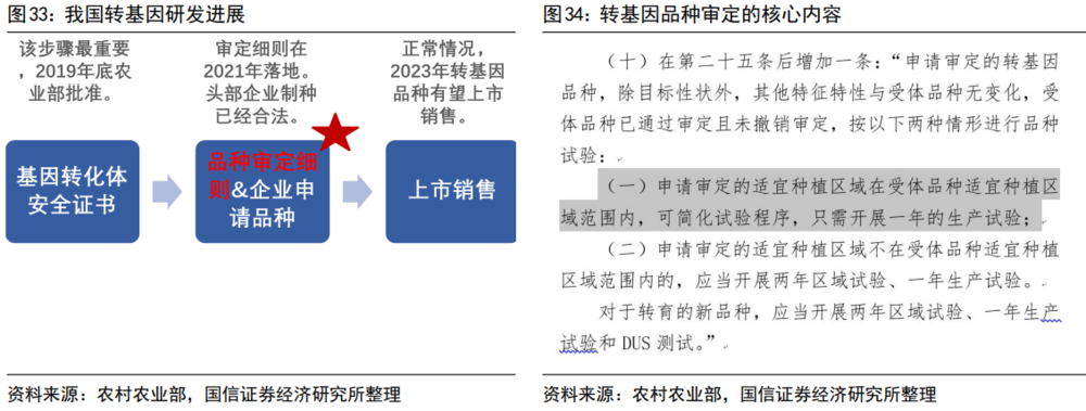 考虑相关绿色通道等政策的推出,预计未来1-2年内有望看到转基因品种的推广,即2022年品种审定名单可以获批,那么转基因品种有望在2023年-2024年上市销售。