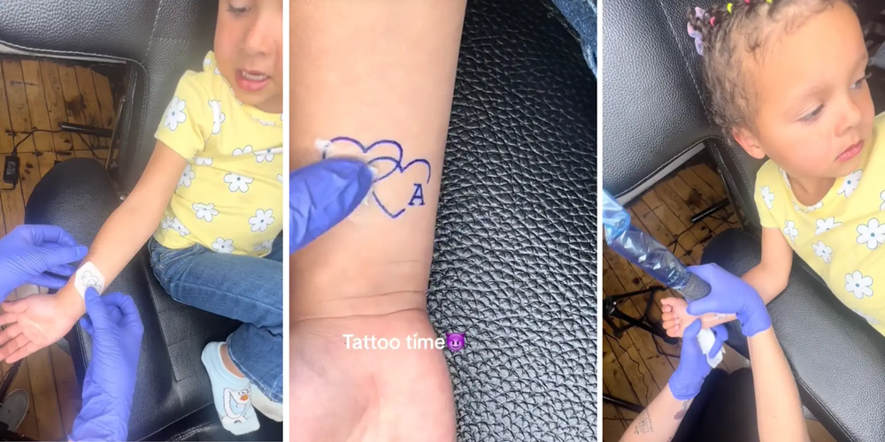 19岁的凯莉·托马斯 (Kaylee Thomas) 是密歇根州的一位纹身师。前几天,她发布了一段标题为“我和我3岁孩子的母女纹身”的视频。画面中,凯莉设计了两颗交织在一起的爱心图案,然后使用看上去很像纹身枪的工具在女儿的手臂上描画,紧接着她在自己的手臂也纹上了同样的图案。