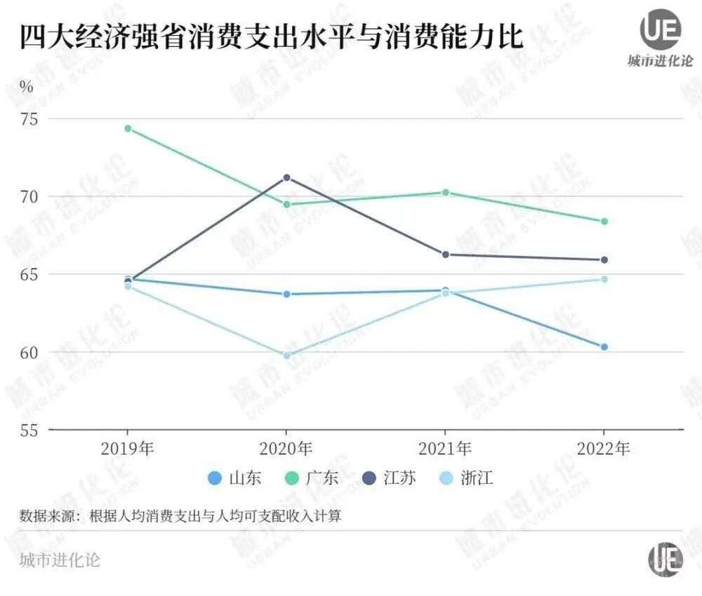 然而,将人均消费支出与人均可支配收入进行比较,浙江的这一比值只有65.6%,比广东的68.4%、江苏的65.9%以及全国平均水平66.5%都低。