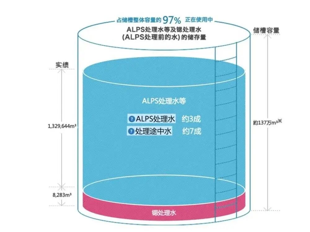根据东京电力公司官网的数据,其现场的储水能力共约137万立方米。截至2023年5月18日,福岛核电站厂址内已经建了1073座储水槽,其中包括ALPS处理水储槽1033座,锶处理水储槽27座,海水淡化处理水27座,浓缩盐水1座。截至6月29日的最新数据是,储水总量已经达到133.8万立方米,已经达到总储水能力的97%。