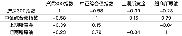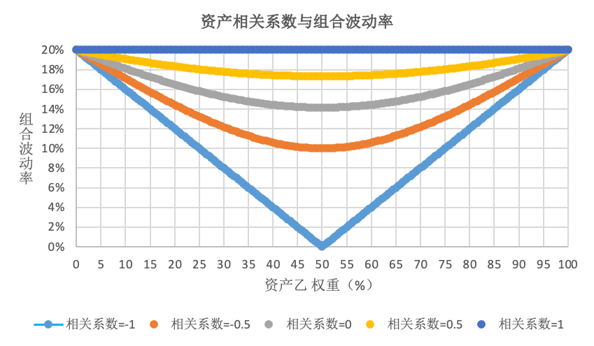 从最终的结果来看,AB“殊途同归”,但组合A以更低的波动,获得了同组合B相同的收益,收益-风险“性价比”更高。对于风险分散的重视程度日渐上升的普通基民来说,A无疑是更优的选择。在投资理论中,波动率代表风险,波动越大,投资出现亏损的可能性就会越高;当然,在投资实践中,波动远不止于一条“冰冷”的数字或曲线,大幅的收益波动更容易放大投资者的焦虑情绪,诱发非理性行为,导致在不理性的追涨杀跌中失去获得长期潜在收益的良机。纵观漫长的投资旅程,集中持有单一资产是把双刃剑:可短暂斩获收益的突飞猛进,但也免不了需时常面对回报的波澜起伏。相比长期收获稳定、持久的“涓涓细流”的资产分散化体验来说,这种“惊心动魄”或许不适合大部分不具有专业知识的基民。想要在投资理财,这场漫长的“交响乐”中,听到舒心、悦耳的旋律,单看收益率是远远不够的,在收益和波动(风险)之间找到最贴合自己口味的平衡点,才能让更加惬意的曲调伴你行稳以致远。或许,人们总会憧憬觅得某一波动(风险)低,但收益高的资产,但在现实中,这几乎是“mission: impossible”(不可能完成的任务),而优质的资产配置方案有可能帮你实现这张“心愿卡”。对于普通基民来说,如何将不同的市场、行业、公司、货币等不同的投资品种进行合理配置,无疑是门大学问,以下是一个简单的案例:假设有甲、乙两种风险资产。尽管两者的波动率都是20%,但不同的组合方式(资产之间的相关系数不同),得到的组合波动率也会出现较大变化(见下图):当甲乙资产相关系数为1时,无论资产乙配置多少,都无法降低组合波动率;当甲乙资产相关系数为±0.5和0时,随着资产乙加入配置,组合波动率会降低;当甲乙资产相关系数为-1,配置50%资产乙,就能把组合波动率降至0,当然,这种完美负相关的资产,在投资实践中非常少见。相关系数:用以反映变量之间相关关系密切程度的统计指标,数值介于区间【-1,1】。在资产配置领域,相关系数可以反映两项资产之间联动性的强弱,当相关系数为-1时,表示完全负相关,两项资产的收益率变化方向和变化幅度完全相反;当相关系数为+1时,表示完全正相关,表明两项资产的收益率变化方向和变化幅度完全相同;当相关系数为0时,表示不相关。例如,下表为最近三年不同资产之间相关系数,可以看到沪深300指数走势与国内债券、黄金、国际油价走势之间相关系数为负,均为负相关;而黄金与其他几类资产之间相关系数较低或负相关。