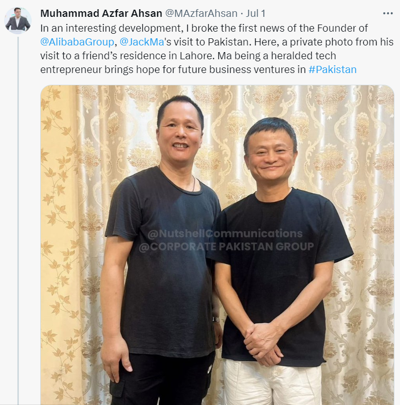 已退出公司一线多年的阿里创始人马云,前不久回国指导阿里巴巴工作之后,就开始了周游世界的旅程。马云此前考察了孟加拉国和尼泊尔,近日则现身于巴基斯坦,当地前国务部长、NutShell集团的创始人阿兹法尔·阿赫桑还在社交平台上晒出了和马云的合照。据阿赫桑透露,马云将在巴基斯坦拉合尔停留超过20个小时,行程十分低调,陪同人员包括5名中国人和2名外国人。消息称,在结束巴基斯坦访问之后,马云还将访问乌兹别克斯坦。(羊城晚报)