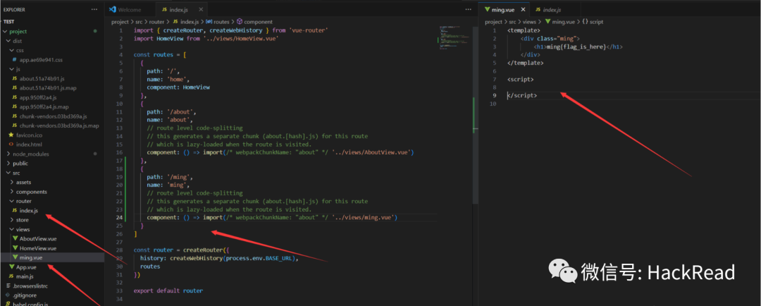 修改两个文件,一个是router目录下的index.js,一个是views目录下的ming.vue