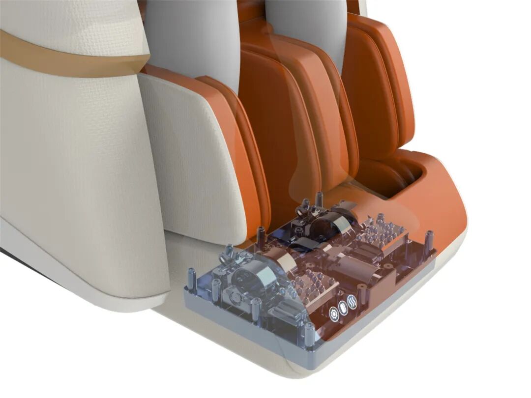 它还不像普通按摩椅那样就脚底一块按摩板了事,而是4重组合按摩:气囊+脚后跟夹捏+脚心滚轮刮痧+脚掌凸点指压。