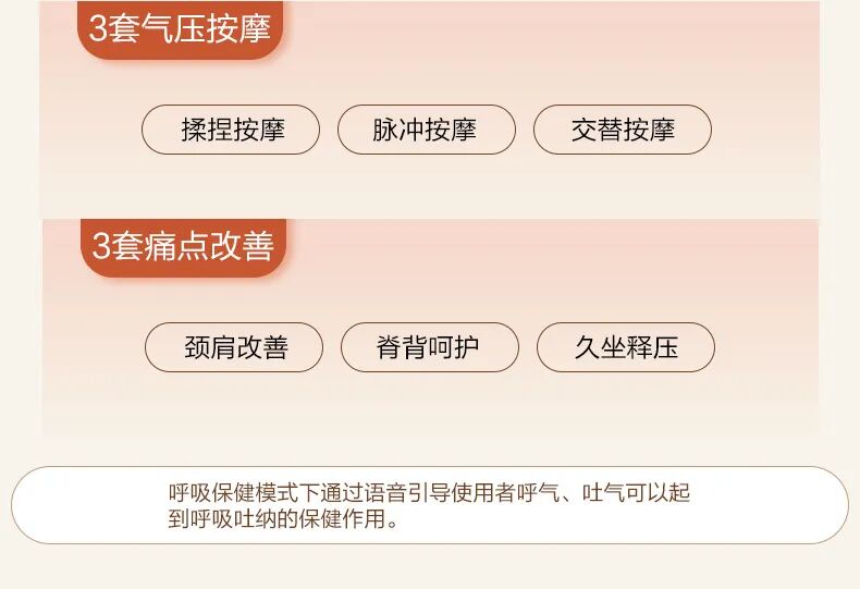 覆盖肩部、手臂、腰背、膝盖、腿部及双足,通过间歇式的充放气,仿真人推、拿、挤、压手法。