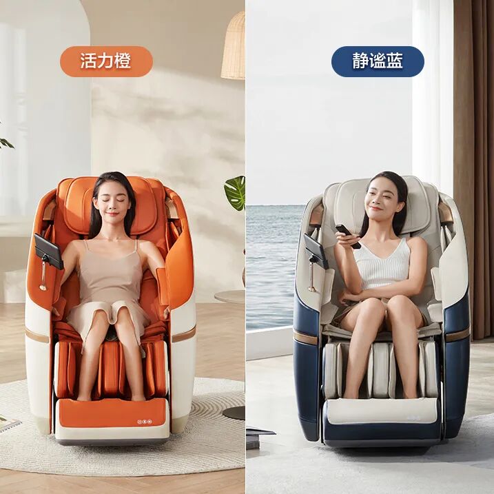 按摩椅外观线条简约流畅,时尚范儿十足,静谧蓝、活力橙两款冷暖分明的配色,