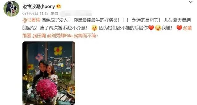马景涛前几年官宣跟小娇妻离婚,眼下又找到比前妻年龄还小的姑娘当对象,女方昨天主动发文@马景涛说偶像变爱人,还特意强调是男方的前任们不懂得珍惜,就算他离了两次婚自己也不介意,文案最后还@出马景涛的合作伙伴们。不过这条内容今天已经删了,但已经引起网友的关注和讨论(吃瓜网友还把他过去家暴的旧闻扒出,嘲女方挑了个老渣男),有说女方是粉丝故意发这一出秀存在感,也有说他俩就是确定关系的对象。
