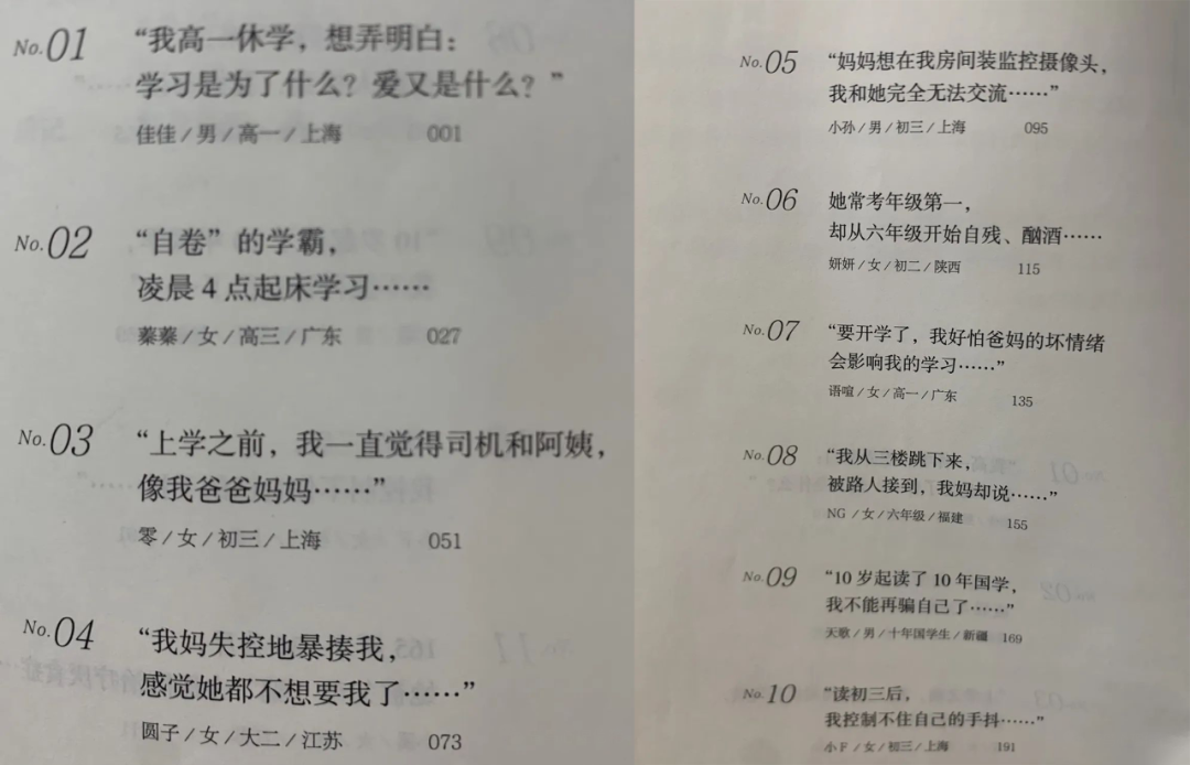 ▲《不被理解的少年:15个与心理疾病斗争的孩子对谈实录》目录