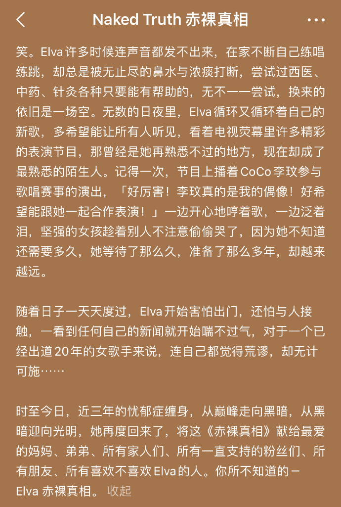 里面写道,那几年,她抑郁缠身,健康状况每况愈下,声音都发不出来。偶然看到电视上偶像李玟的演出,才强行打起精神: