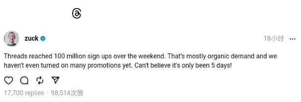 要不是真的到了这一天,我还真不敢相信,不到一周的时间,小扎的社交 App —— Threads 注册用户已经破亿了。