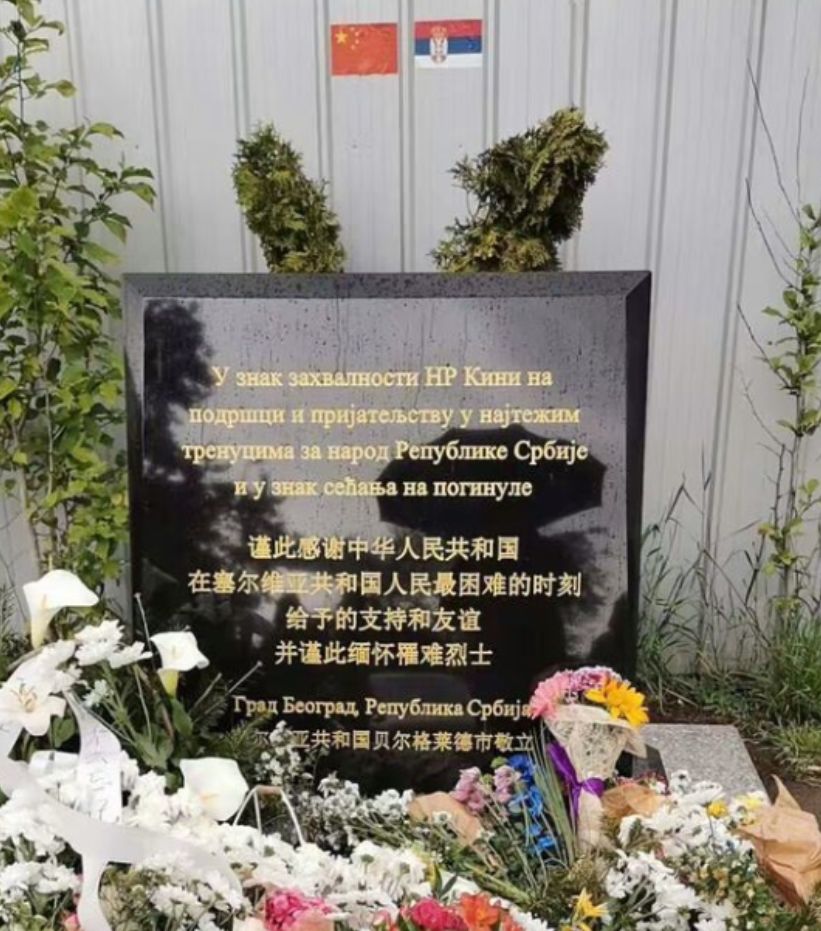 “谨此感谢中华人民共和国在塞尔维亚共和国人民最困难的时刻给予的支持和友谊,并谨此缅怀罹难烈士。”