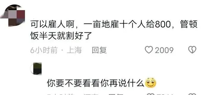 有的网友觉得是农民不舍得花钱。说:可以雇人啊,一亩地雇十个人给800,管顿饭半天就割好了...一天给800?一亩地的收成有多少,你们算过账吗?亏你想的出来!