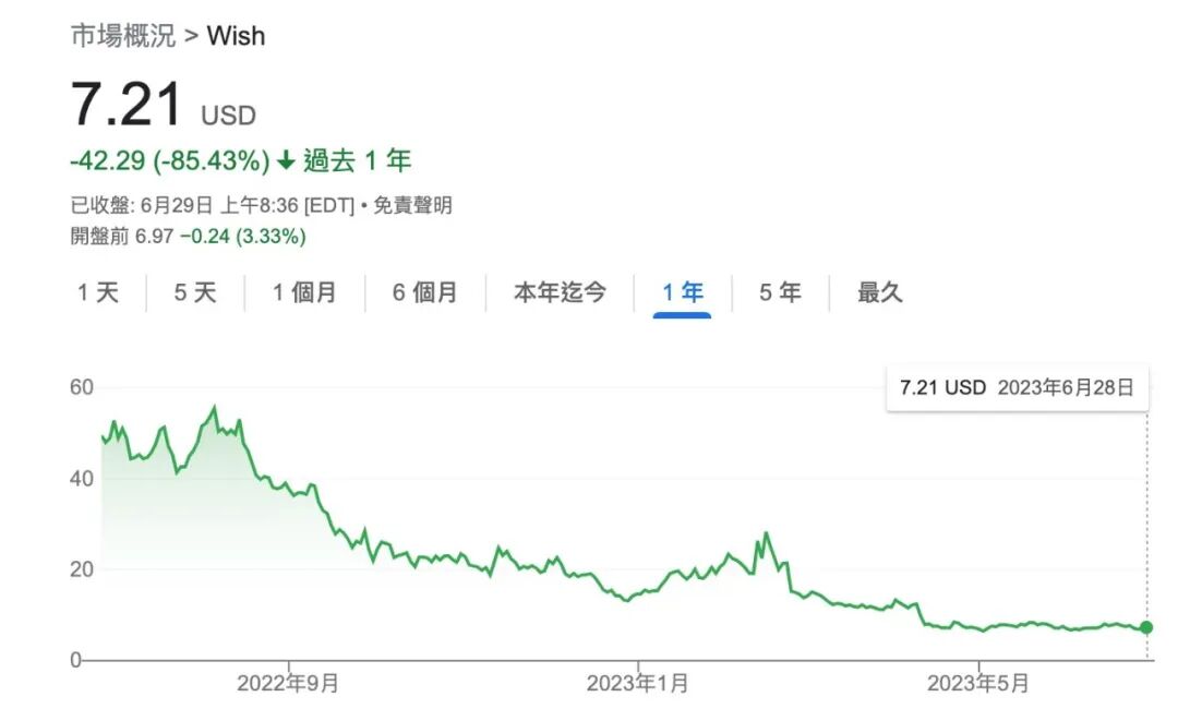 就目前的情况看,Temu的流量还极度依赖广告投入的“强心针”,它似乎正在陷入与Wish相同的陷阱中。同样是以中国性价比货品出海为主的跨境平台,2020年,Wish销售额达25亿美元,当年营销支出高达17亿元。但当它停止广告投入后立刻风光不再。2022年,Wish年销售额锐减至约 5 亿美元,如今Wish的股价已经跌去87%,亏损还在扩大。