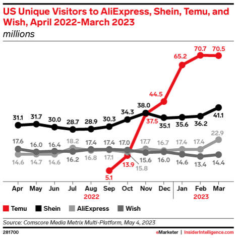 2022年4月至2023年3月,在美速卖通、Temu、SHEIN、Wish访问量对比