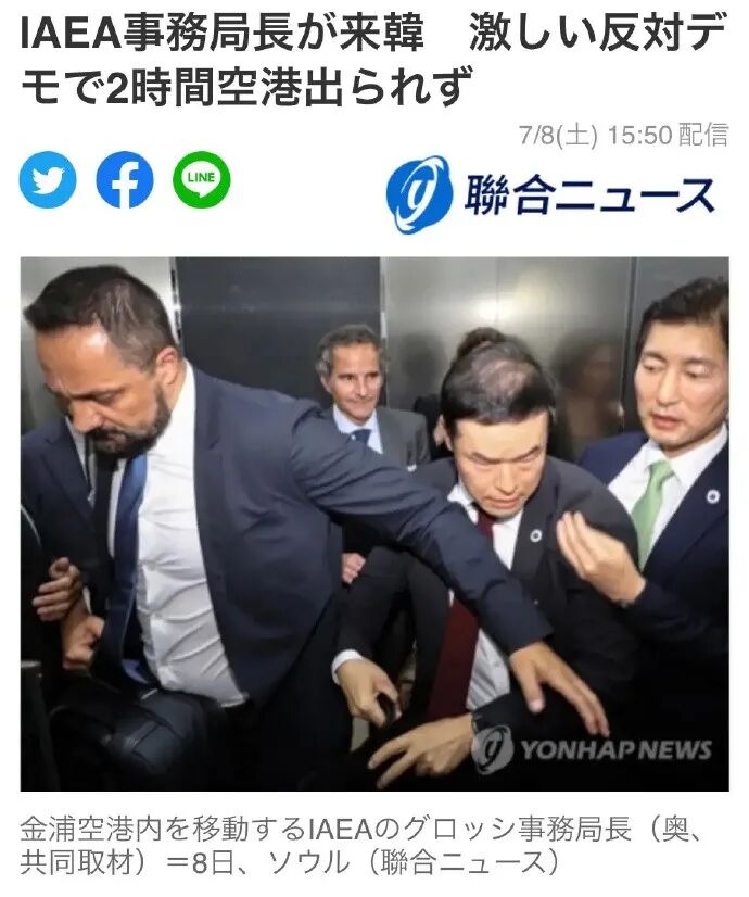 韩国民众比较可怜。因为他们的政府出卖了他们,在那儿支持日本。韩国人民在国内抗议无效,将怒火释放到国际原子能总干事格罗西,据报道,格罗西因为被韩国民众包围,在首尔金浦国际机场滞留两个小时。
