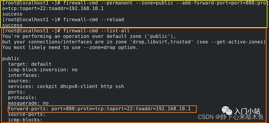 > firewall-cmd --permanent --zone=public --add-forward-port=port=888:proto=tcp:toport=22:toaddr=192.168.10.1