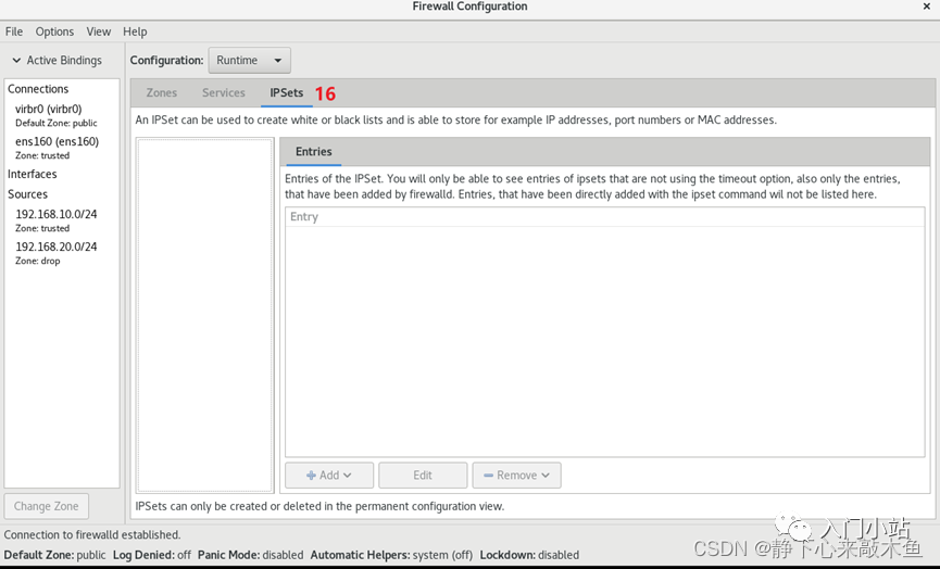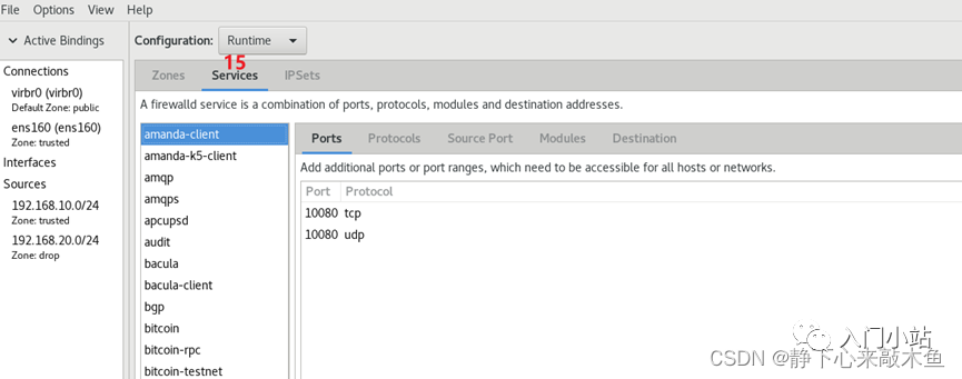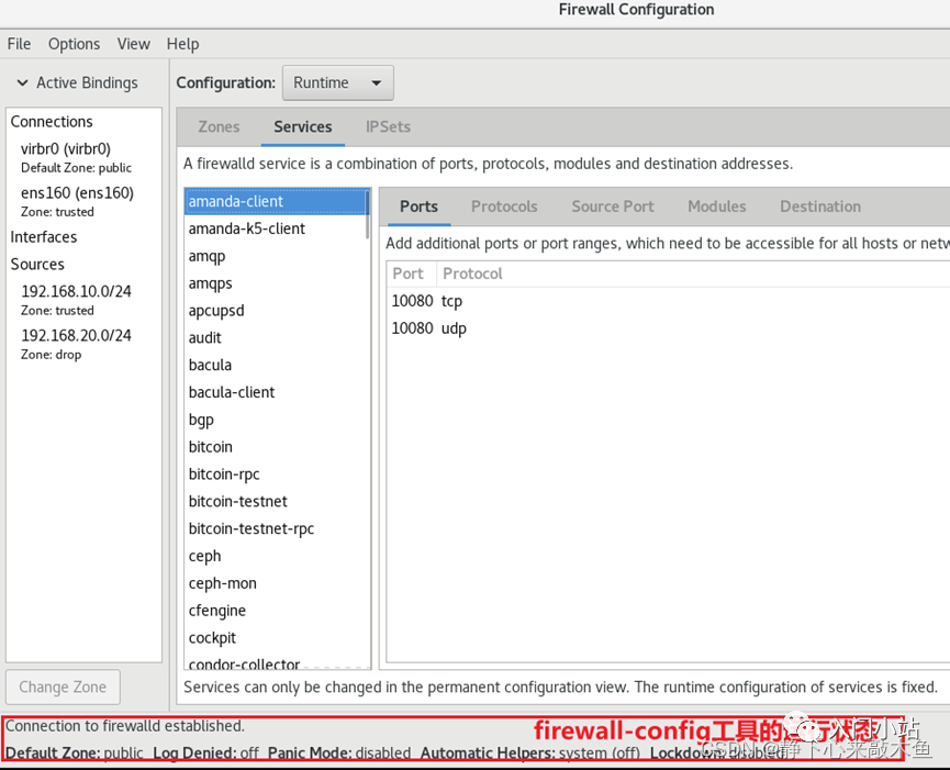 > firewall-cmd --zone=trusted--add-interface=ens160 将此网卡与 trusted 区域绑定(允许从此网卡发来的流量)