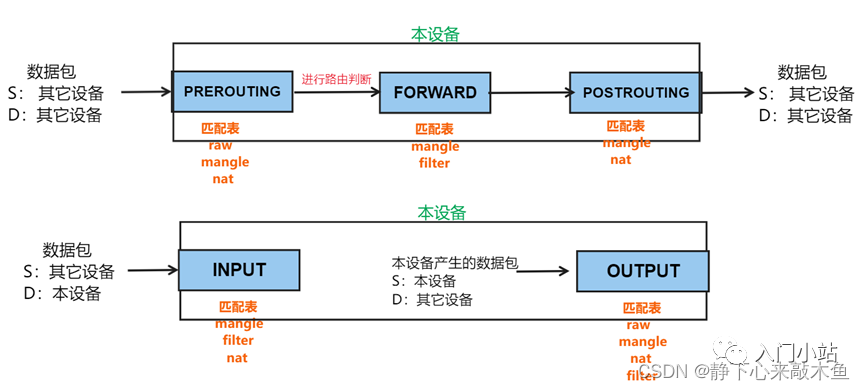 INPUT 处理入站的数据包(处理目标是本机的数据包) OUTPUT 处理出站的数据包(处理源是本机的数据包,一般不在此链上做规则) PREROUTING 在进行路由选择前处理数据包(一般用来做 NAT Server) POSTROUTING 在进行路由选择后处理数据包(一般用来做源 NAT) FORWARD 处理转发的数据包(处理经过本机的数据包)