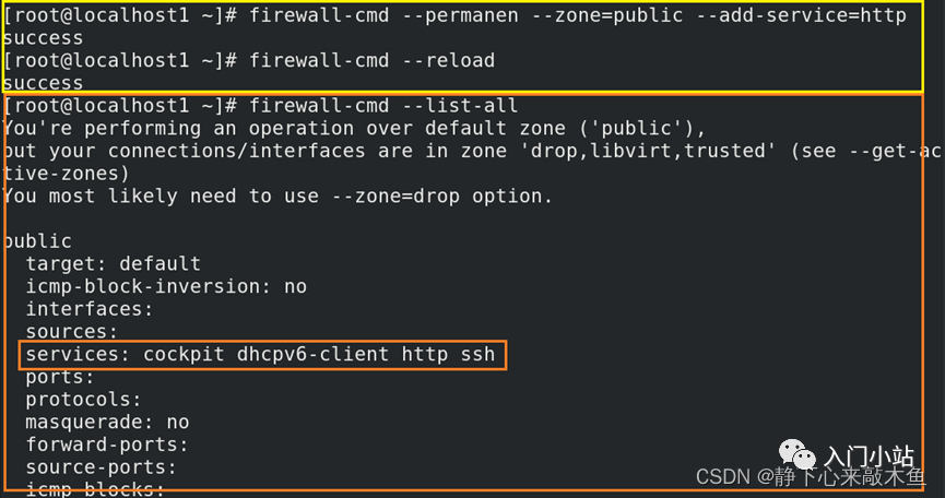 > firewall-cmd --zone=public --add-service http 配置 public 区域允许通过 http 协议
