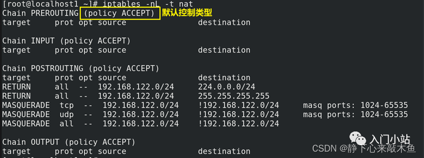 iptables -nL -t nat 查看 nat 表的规则链 -n 使用数字形式显示输出结果(如:通过 IP 地址) -L 查看当前防火墙有哪些策略 -t 指定查看 iptables 的哪个表(默认是 filter 表)
