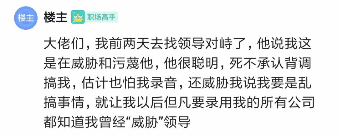 楼主也去找前领导对峙了,但前领导不承认背调说坏话,指控楼主威胁污蔑他,还说以后要让所有背调公司都知道楼主曾经“威胁”领导。