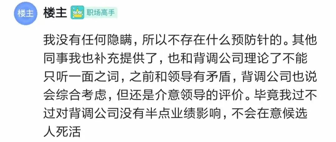 背调不通过后,楼主和背调公司理论不能只听前领导的一面之词,毕竟之前和前领导有矛盾,背调公司说过会综合考虑,但最后还是介意领导的评价。