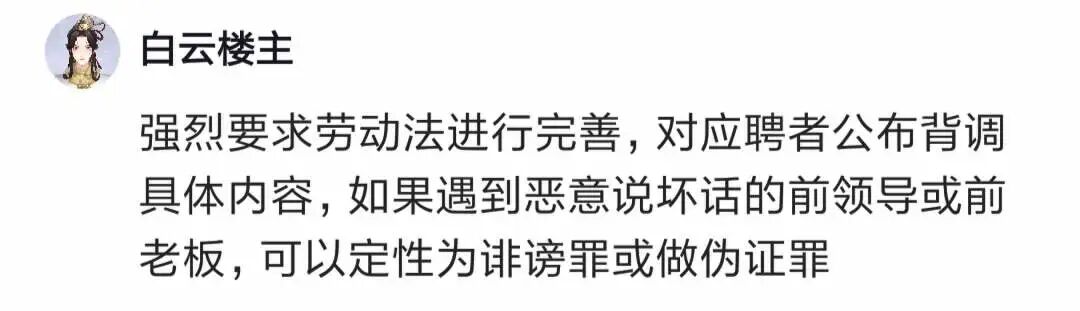 有人呼吁完善劳动法,对应聘者公布背调具体内容,如果遇到恶意说坏话的前领导,可以定性为诽谤罪或者作伪证罪。