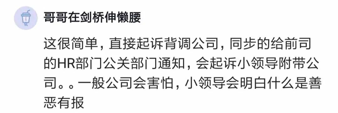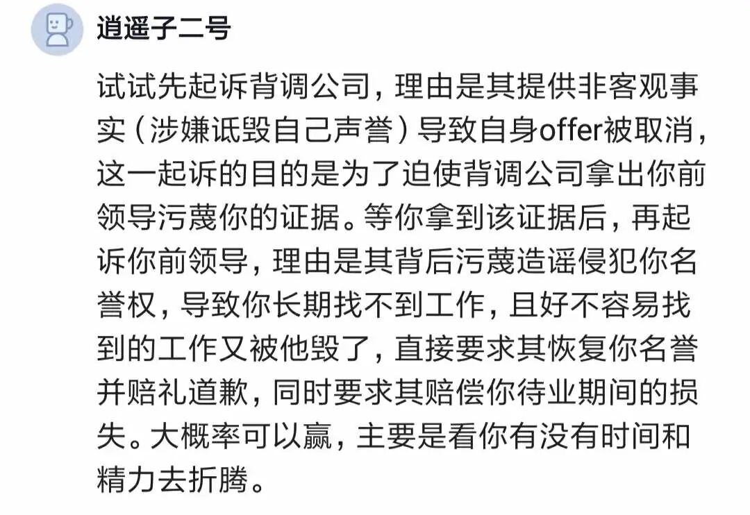 有人说,先起诉背调公司,理由是提供非客观事实导致offer被取消,迫使背调公司拿出前领导污蔑自己的证据。拿到证据后起诉前领导,理由是他污蔑造谣侵犯自己名誉权,导致自己工作被毁,要求他恢复自己名誉并赔礼道歉,同时赔偿待业期间的损失。