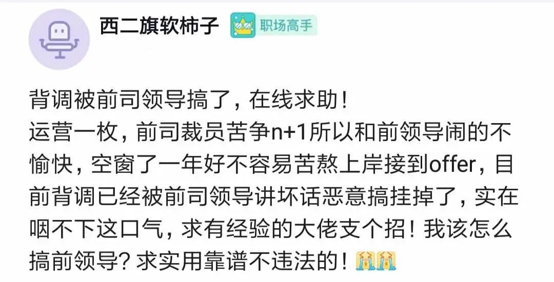 运营一枚,被前公司裁员,苦争n+1,所以和前领导闹得不愉快。空窗了一年,好不容易苦熬上岸接到offer,但背调被前司领导恶意讲坏话搞挂掉了。