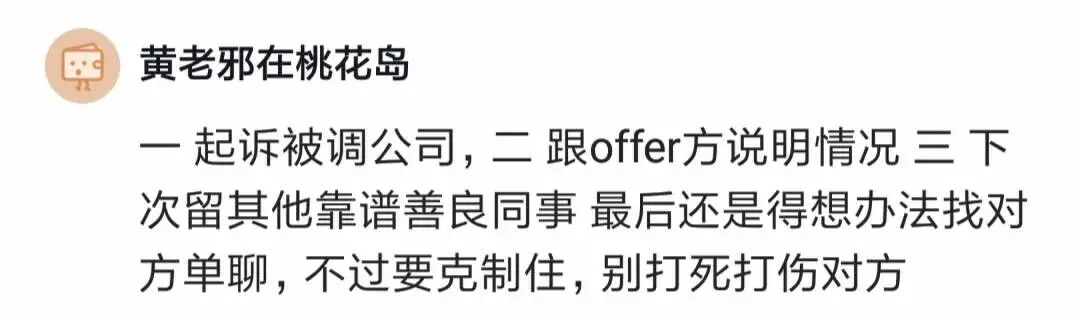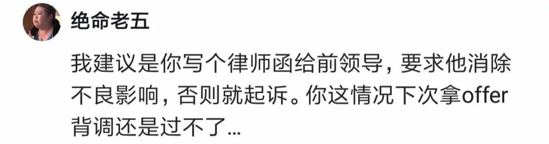 有人说,起诉背调公司,跟offer方说明情况,下次背调留其他靠谱善良的同事,最后还是要想办法找对方单聊。