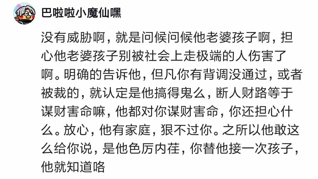 有人让楼主去“问候”前领导的老婆、孩子和父母。