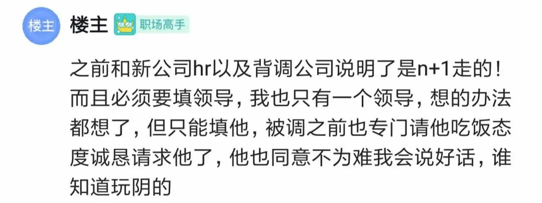 楼主说,之前和新公司hr以及背调公司说明了自己是拿n+1走的。背调时必须填领导,自己只有一个领导,只能填他,也补充提供了其他同事。背调之前还专门请前司领导吃饭,态度诚恳地请求他,他也同意会说好话,谁知道背地里玩阴的。